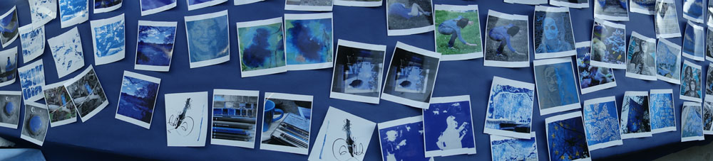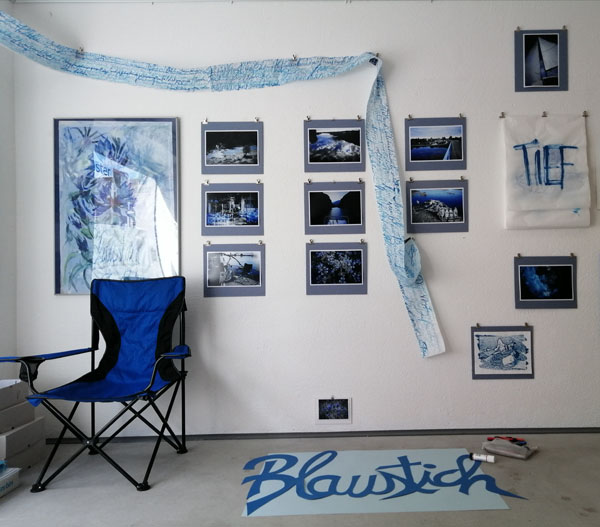 Abklopfen, was in der Farbe Blau steckt, mit fotografischen Techniken wie der Cyanotypie und Blaufiltern. Blau rückt aus der Ferne in den Vordergrund, Gewässer lösen sich aus ihrer Umgebung, werden eigenständige blaue Form. Ein Spiel mit der Farbe Blau zugeschriebenen Aspekten wie Romantik und Männlichkeit. Eine Begegnung mit blauen Blumen und blauen Blazern, eine Huldigung an eine große Frau in diesem Kleidungsstück – und eine an eine mutige Kapitänin zur See. In Textnetzen erzählte persönliche Blaugeschichten von Ferne und Nähe, tiefen Wassern und Abschied. Dazu ein neu entworfenes blaues Schild und ein eigens für die Ausstellung entworfenes Memory, das Wahrnehmungsgewohnheiten reflektiert.